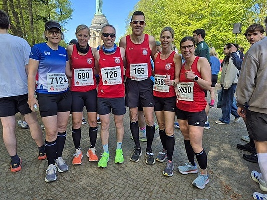Für sechs Läuferinnen und Läufer ging es, am letzten Sonntag, auf die 31,1 Kilometer lange Strecke vom Hermannsdenkmal nach Bielefeld. Als erster nach der abwechslungsreichen Strecke mit Panzerbrücke, 17% Steigung und Treppen kam Matthias Ridder als erster auf der Promenade nach 2:17:39 Stunden an und war damit nochmal rund 4 Minuten schneller als im Vorjahr. Als insgesamt 30. Frau und Dritte der W40 erreichte Verena Henze nach 2:28:15 Stunden das Ziel. Etwas dahinter in gewohnter "Adler" Pose Frank Hansmann mit einer Zeit von 2:34:27 Stunde. Danach folgten Ines Kölker mit 3:17:26 Stunden, Hermannslaufneuling Christin Hansmann (3:30:09 Stunden) und Dauerbrennerin Mechthild Koch mit 3:51:26 Stunden.