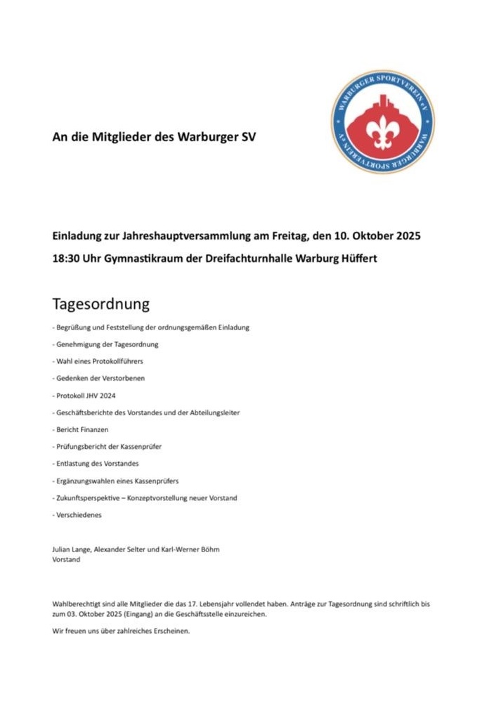 Hiermit laden wir alle Vereinsmitglieder zur Jahreshauptversammlung am 10. Oktober 2025 ab 18:30 Uhr in den Gymnastikraum der Dreifachturnhalle Warburg (Wachtelpfad 20) ein. Wir freuen uns über zahlreiches Erscheinen.