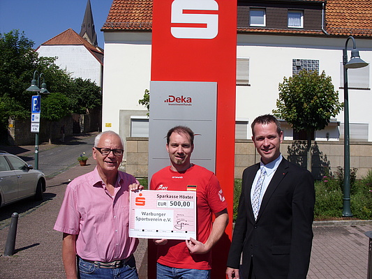 Glücklich konnten Warburger SV Vorsitzender Helmut Motyl (links) und Leiter für Sportwesen Thomas Riesen (Mitte) eine Scheck über 500 Euro von der Sparkasse Höxter entgegennehmen. Aus den Händen von Warburgers Filialleiter Sven Gross kam für den Warburger SV der warme Geldsegen. "Wir werden das Geld in die Allgemeine Förderung der Jugend investieren", so Thomas Riesen für die Verwendung.