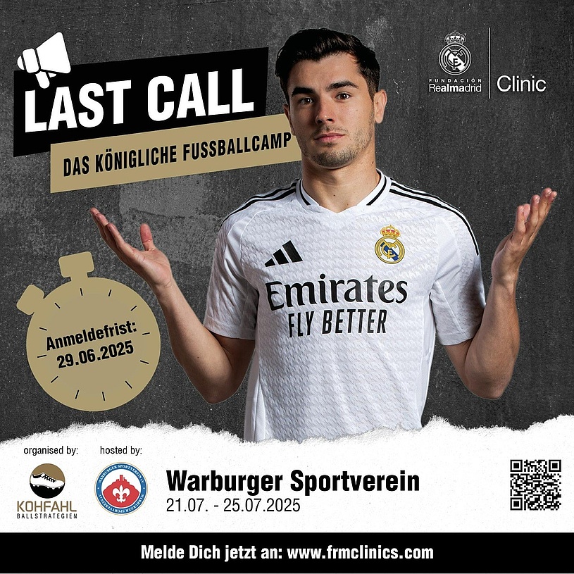 Sichere Dir jetzt noch schnell Deine Teilnahme an unserem königlichen Fußballcamp, bevor es zu spät ist. Die Fundación Real Madrid Clinic organisiert von Kohfahl Ballstrategien ist vom 21.07.25 – 25.07.25 zu Gast beim Warburger Sportverein. Top-Coaches trainieren Dich nach der Fundación Real Madrid Methodik und unterstützen Dich bei Deiner Entwicklung – fußballerisch und charakterlich. Das solltest Du nicht verpassen!